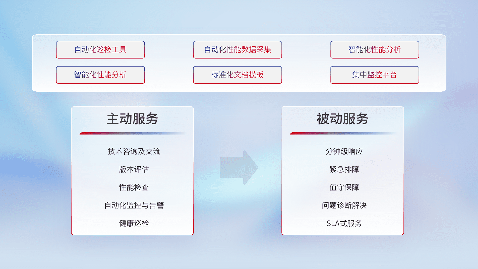 智能化工具和标准化文档,,,保障服务质量,,提供主动服务(包含技术咨询、、、版本评估、、、、性能检查、、、自动化监控与告警、、、健康巡检)和被动服务包含(分钟级响应、、、紧急排障、、、、值守保障、、、问题诊断解决、、、、SLA服务)。。。。